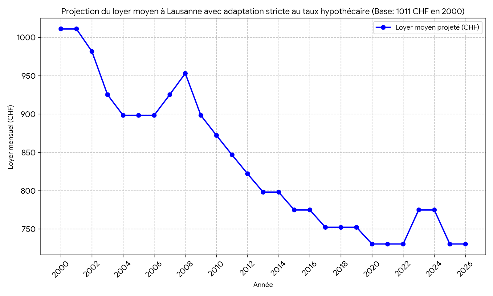 Depuis l’an 2000, les taux hypothécaires n’ont cessé de chuter, passant d’environ 4,00 % à un plancher historique de 1,25 %. Dans un système où l’alignement serait automatique et obligatoire, un loyer moyen lausannois de 1011 CHF en 2000 ne devrait coûter que 730 CHF aujourd’hui.