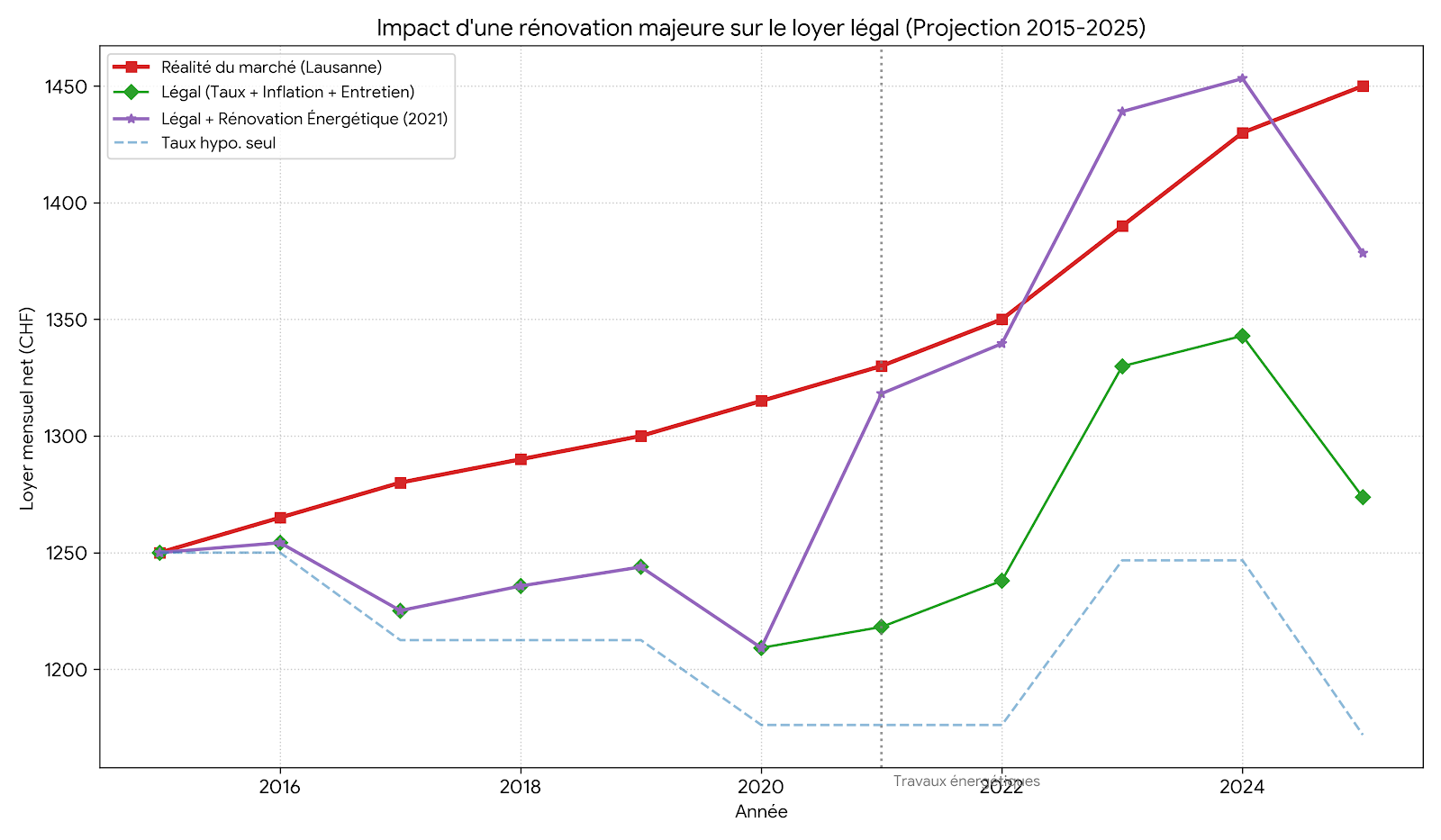 Après avoir forcé le trait, ajustons nos données en prenant quelques paramètres supplémentaires. Les propriétaires font souvent valoir que les coûts d’entretien et l’inflation (IPC) justifient les prix actuels. Pourtant, si l’on ajoute à notre calcul 40 % de l’inflation annuelle (Art. 12 OBLF) et un forfait d’entretien de 0,5 %, le loyer « légal maximum » reste bien en dessous des prix du marché.
