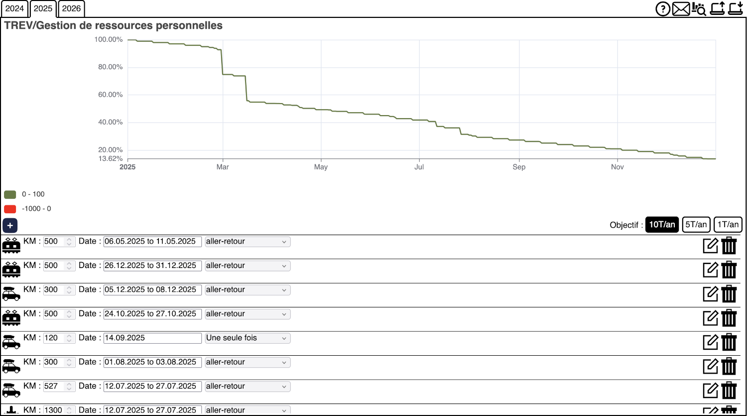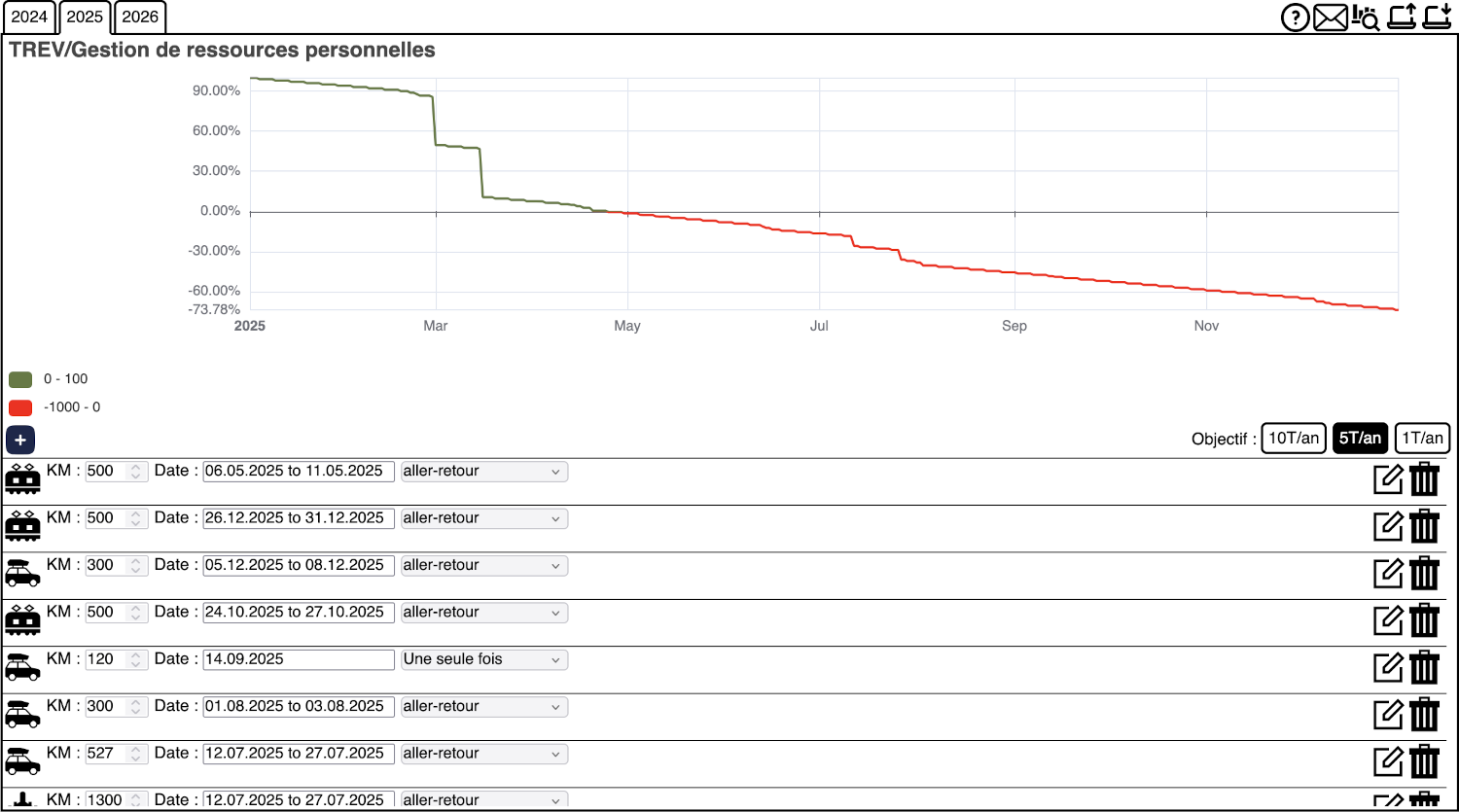 Jour de dépassement fin avril 2025, solde négatif de 73.78% en fin d'année, soit 3689kg de CO2 émis en trop.