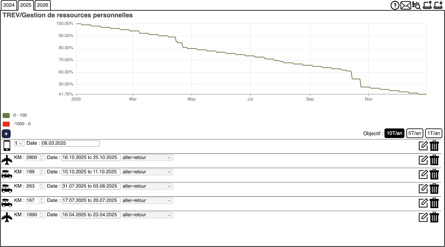 Jour de dépassement fin avril 2025, solde négatif de 73.78% en fin d'année, soit 3689kg de CO2 émis en trop.