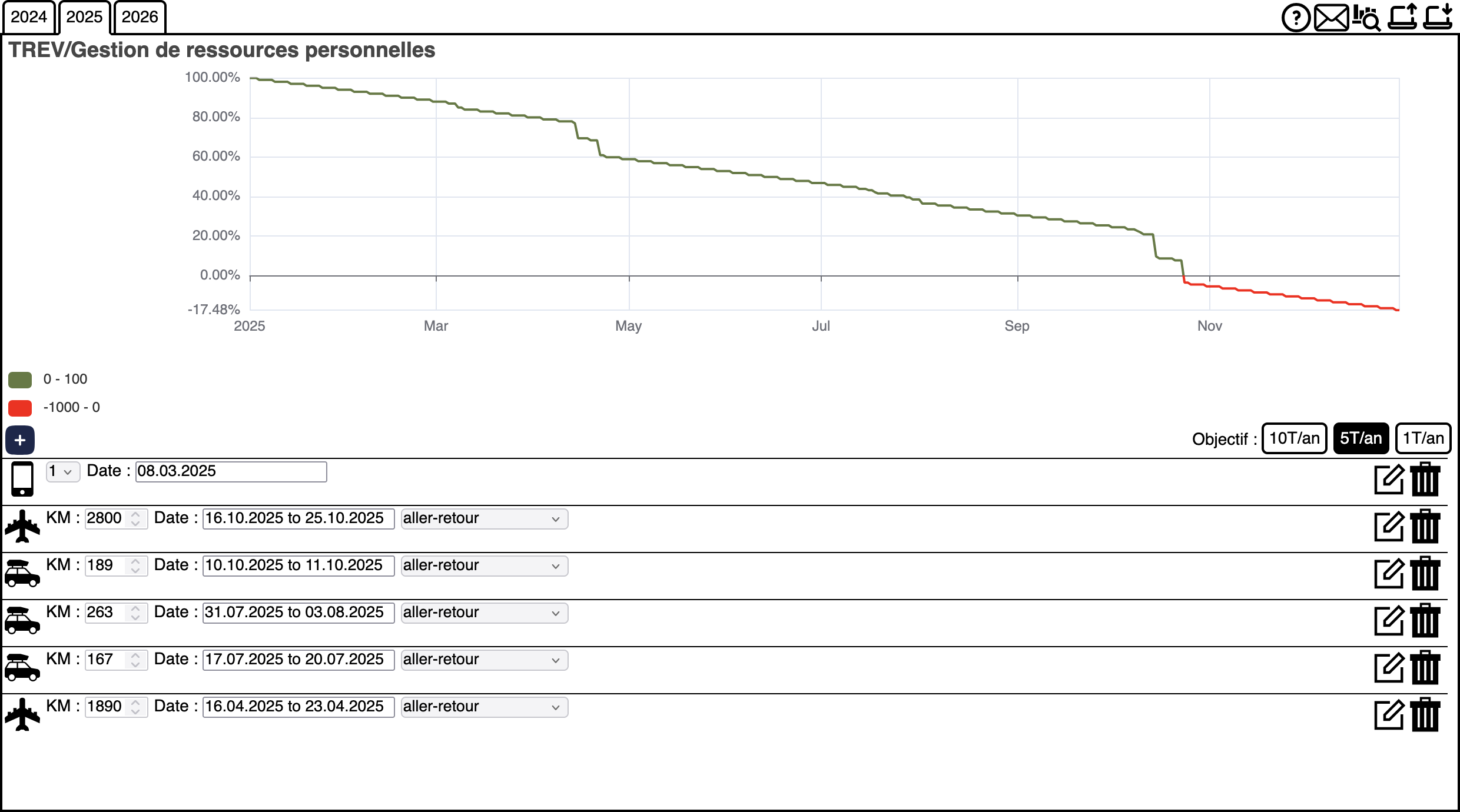 Jour de dépassement fin octobre 2025, solde négatif de 17.48% en fin d'année, soit 873kg de CO2 émis en trop.